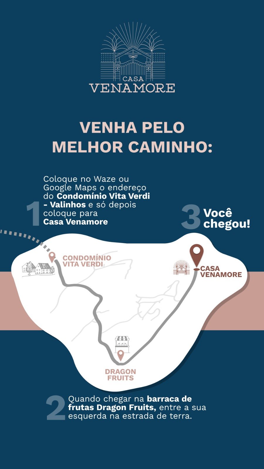 Caso prefira, ao chegar próximo do condomínio Vita Verdi, basta buscar por CASA VENAMORE em seu GPS, assim, você será direcionado pelo melhor caminho até o local.